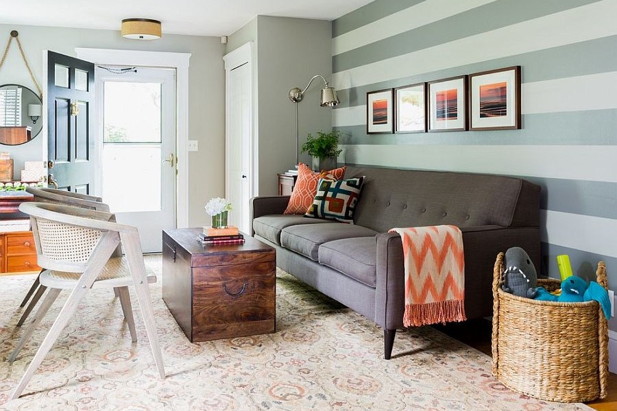 Dengan pola garis-garis vertikal ruangan akan terlihat lebih tinggi sedangkan pola garis horizontal pada warna cat ruang tamu membuat ruangan terkesan lebih luas.