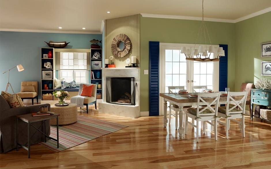 Salah satu kombinasi warna cat ruang tamu yang bisa diterapkan untuk konsep ruang tamu terbuka (open plan) adalah warna biru muda dan hijau pastel. Kombinasi warna cat ruang tamu ini cocok digunakan untuk kamu yang ingin lebih eksploratif dalam mendekorasi ruang tamu.