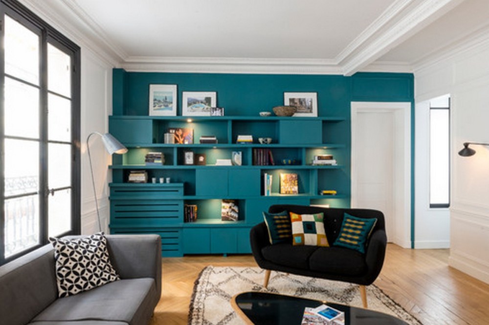 Efek elektik hasil dari kontras dua warna cat ruang tamu ini akan semakin hidup saat dipadukan dengan furnitur dan elemen dekor ruangan berwarna cerah.