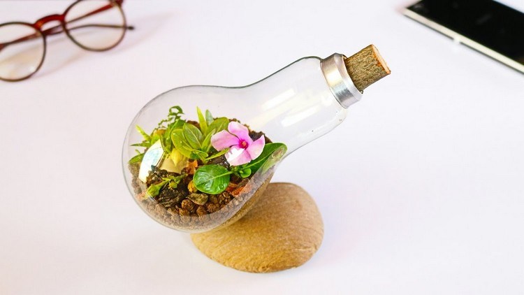 Kreasi barang bekas yang terakhir menggunakan bohlam yang sudah dikosongkan. Benda berukuran kecil ini bisa dimanfaatkan menjadi wadah terrarium yang diletakkan di atas meja atau digantungkan di sudut hunian.