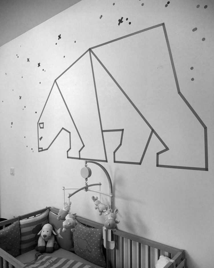 Karena washi tape berbentuk lurus, maka gambar yang dihasilkan akan berbentuk geometrik seperti dekorasi dinding beruang di atas.