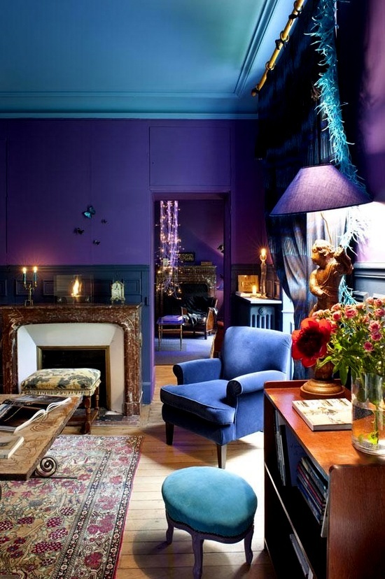 Untuk suasana pada interior ruang tamu yang dramatis, perpaduan warna biru dan ungu adalah pilihan yang tepat.