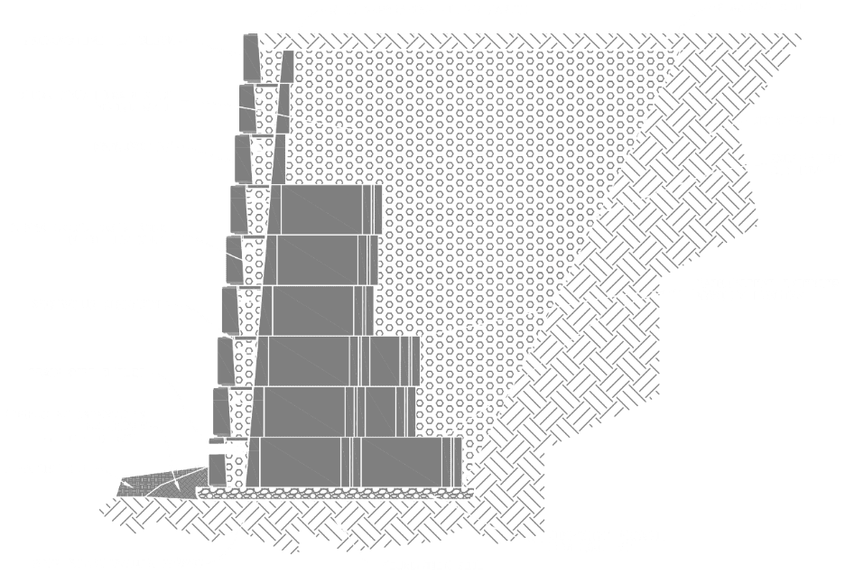 - Stem (Badan Dinding Vertikal) Bagian vertikal yang langsung berinteraksi dengan tekanan tanah. Desain stem bisa bermacam-macam dari gravity wall (mengandalkan berat sendiri), cantilever wall (menggunakan tulangan beton), hingga counterfort wall untuk ketinggian ekstrem.