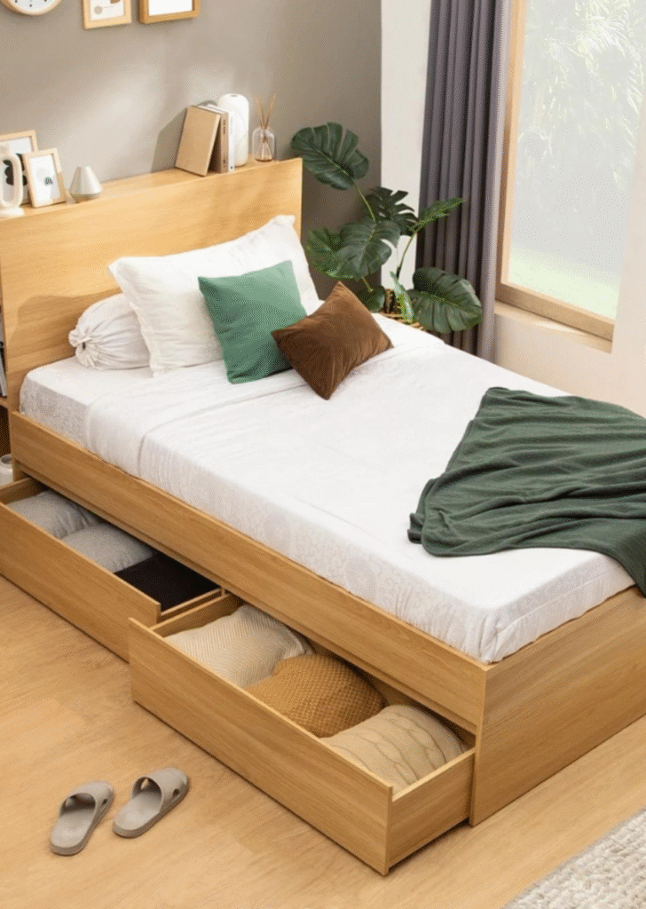 Pilihan lain yang juga bisa kamu pertimbangkan adalah dipan unik dengan laci. Dengan dua buah laci di sisi kanan dan kiri, keduanya bisa kamu gunakan sebagai tempat penyimpanan pakaian, seprai, selimut, buku, atau perlengkapan lainnya. Tidak sampai di situ, dipan ini juga dilengkapi kepala dipan yang dapat berfungsi sebagai sandaran ketika beristirahat.